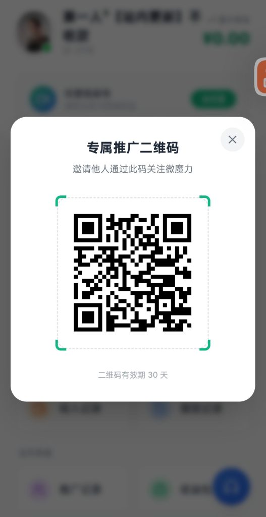 做团队躺赚大钱!纯绿色项目不封控提现秒到账! 每天进去提现就可以了! 要实名认证一下才有收益! 专属推广二维码 X 邀请他人通过此码关注微魔力 二维码30天有效