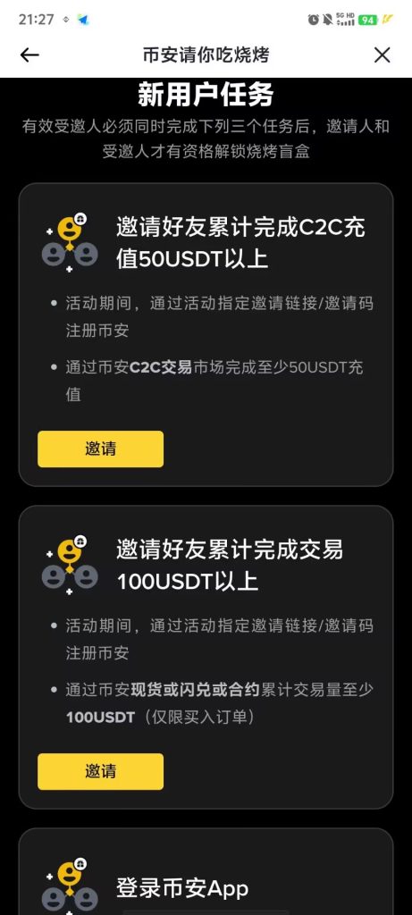 币安刚出的活动 币安请你吃烧烤,最高15刀 也就是100左右的利润 门槛非常低