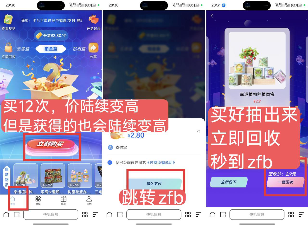 2、进入后点击首页,然后点上方立即购买,绑定zfb,之后支付后会自动抽取实物然后点回收就会自动到账到zfb。他这个每次种的金额都会比你支付的本金多几毛钱。所以是必赚的!ps:如果显示通道堵塞,那就之后再试过一两个小时再弄