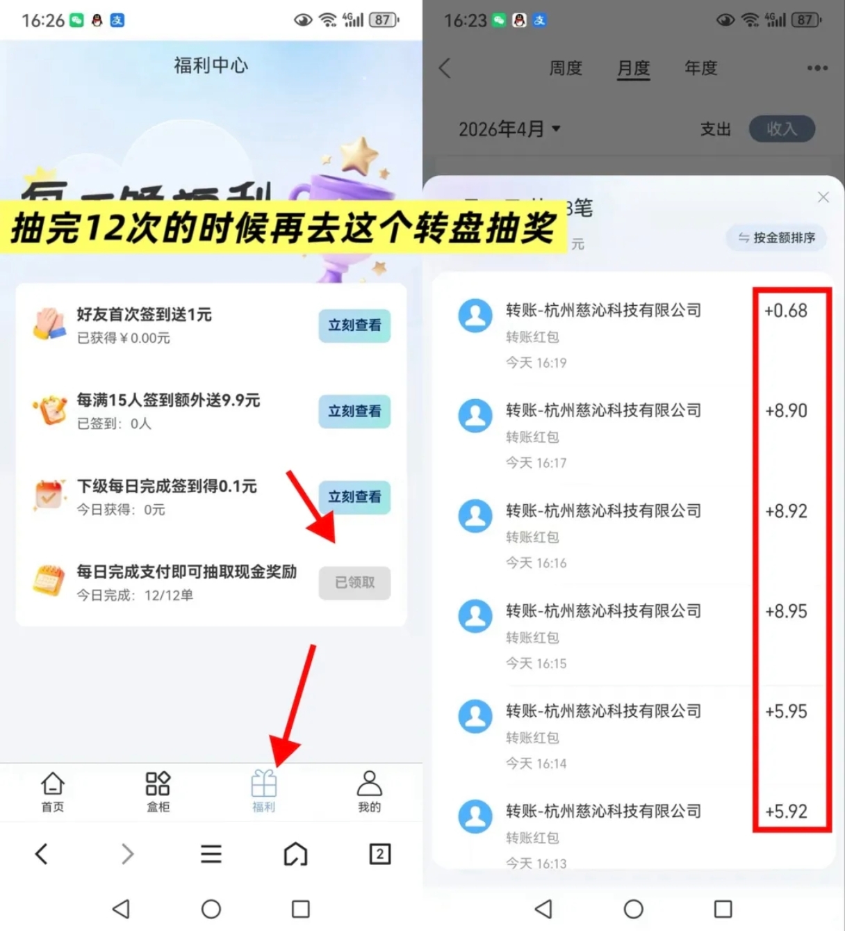 3、显示回收成功就是提现到账了,再去第二次支付,每天12次。2.8米3次,3.6米3次,5.8米3次,8.8米3次,一共12次每天做完12次之后还可以去福利里面抽奖,抽到多少都是自动到账zfb。