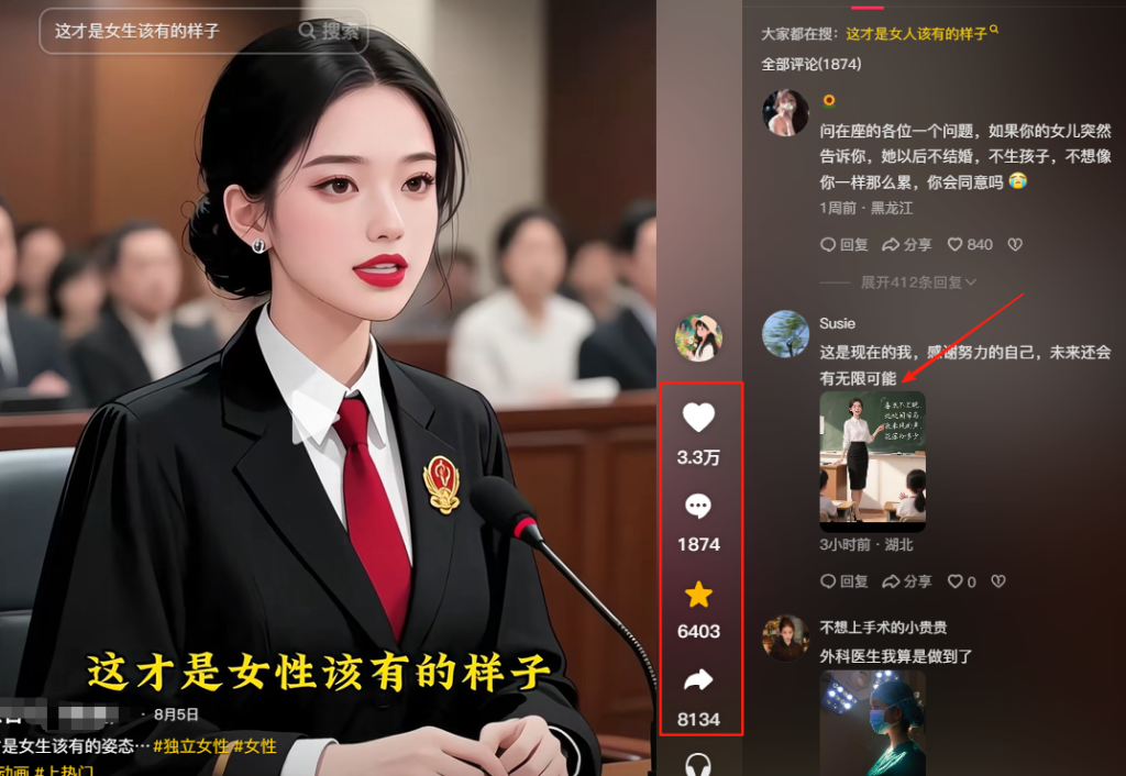 比如下面的这个爆款视频:这才是女性该有的姿态——通过展示各行各业中专业、自信、闪光的女性形象,打破刻板印象,传递“女性力量”和“自我实现”的价值观。